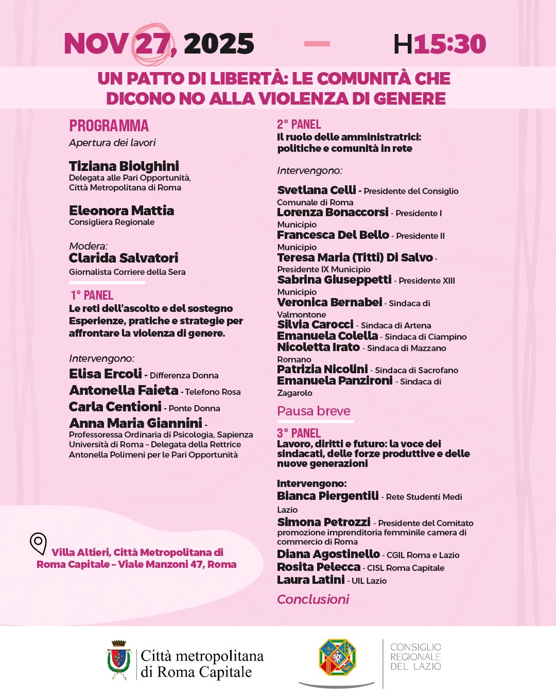 L’evento, che si svolge in occasione della Giornata Internazionale per l’eliminazione della violenza contro le donne del 25 novembre, è promosso da Eleonora Mattia, consigliera regionale del Lazio, e da Tiziana Biolghini, Delegata alle Pari Opportunità della Città Metropolitana di Roma Capitale.