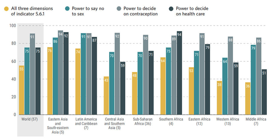 Fig.2: Percentuale di donne di età compresa tra i 15 e i 49 anni che prendono le proprie decisioni in materia di salute e diritti sessuali e riproduttivi (compresa la decisione sulla propria assistenza sanitaria; la decisione sull’uso della contraccezione; e la possibilità di dire no al sesso), per regione SDG, dati più recenti 2007-2018 (come risulta da dati report UNFPA)