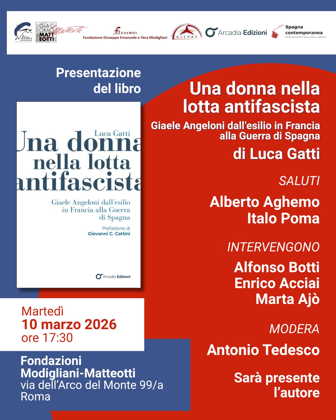 Martedì 10 marzo alle ore 17.30, presso la sede delle Fondazioni Modigliani-Matteotti (via dell’Arco del Monte 99/a, Roma) verrà presentata la prima biografia su Giaele Angeloni. Il volume di Luca Gatti, edito da Arcadia edizioni per la collana di Studi storici della Fondazione Nenni, rappresenta un’opportunità, a novant’anni dallo scoppio della Guerra civile di Spagna, per approfondire la vicenda umana e politica di una delle protagoniste dell’antifascismo e della battaglia per l’emancipazione delle donne.